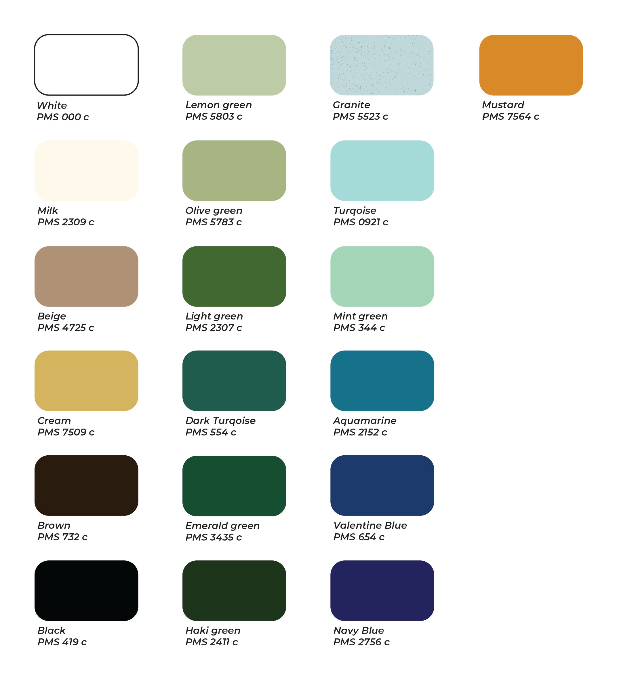 We have made complete color chart for our enamelware and print colors and you can download it to use in combination with our template files.