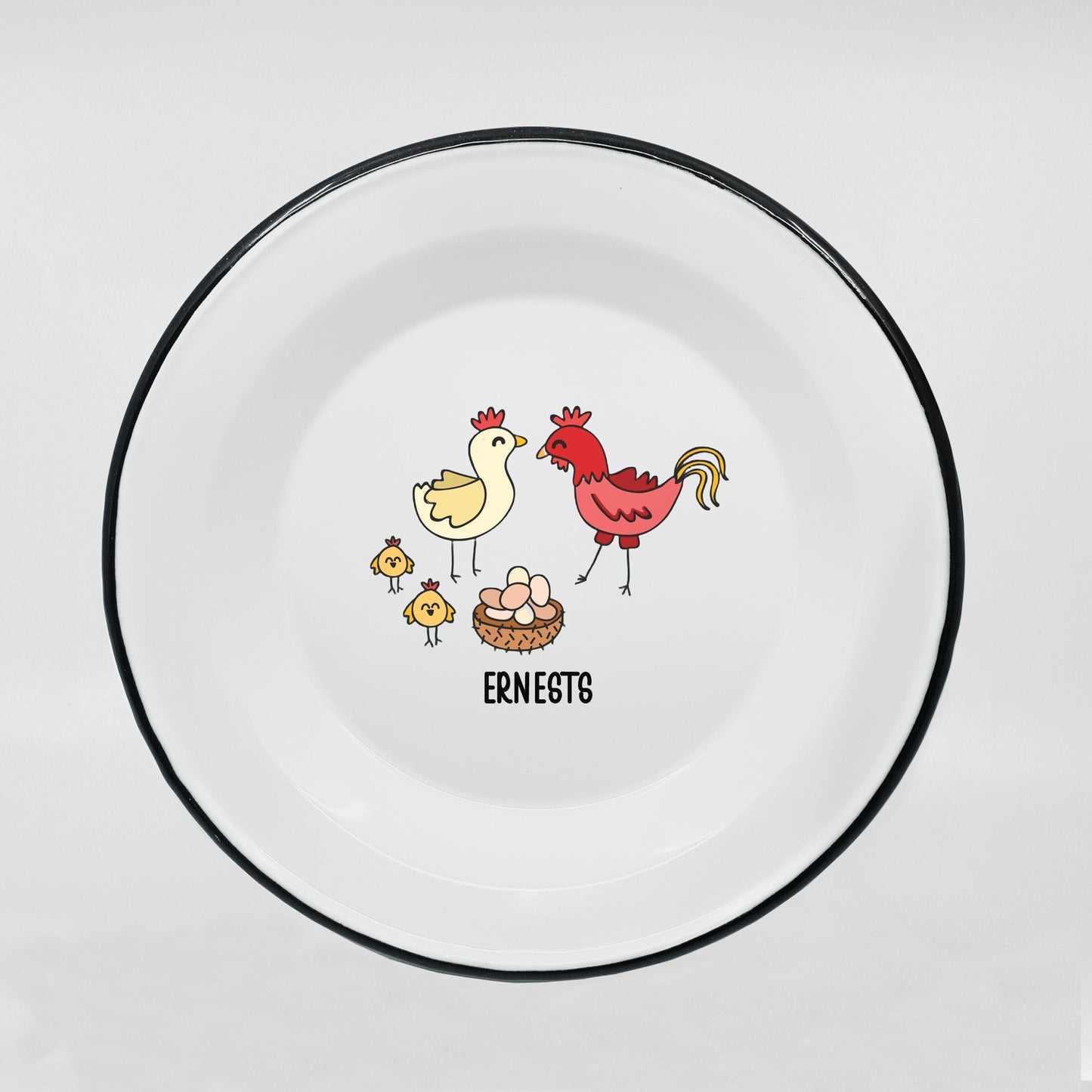 Kids enamel dinner plate with chicken print and your name.